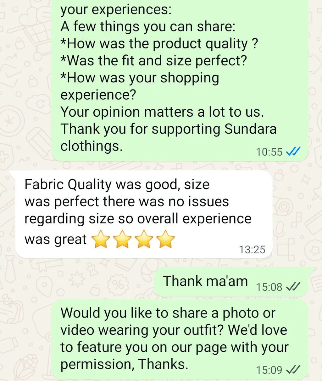 For any size-related questions, you can either contact us by clicking on the WhatsApp icon at the bottom right. You can also contact us via email at clothingssundara@gmail.com.